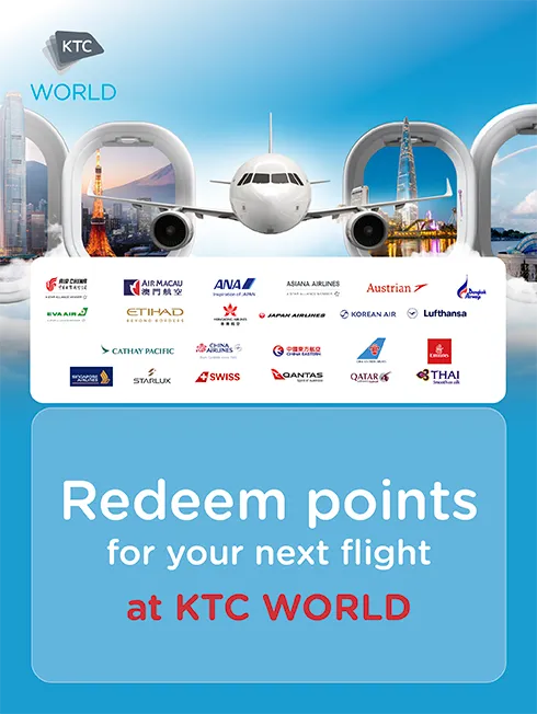 1. Internation routes, round trip, economy class. The rate for using KTC FOREVER points to redeem the above air tickets excludes airport taxes and fuel surcharges. The number of points used for redemption may change depending on the seat, travel date and fluctuation of fuel tax. Please check with the officer before making a reservation.