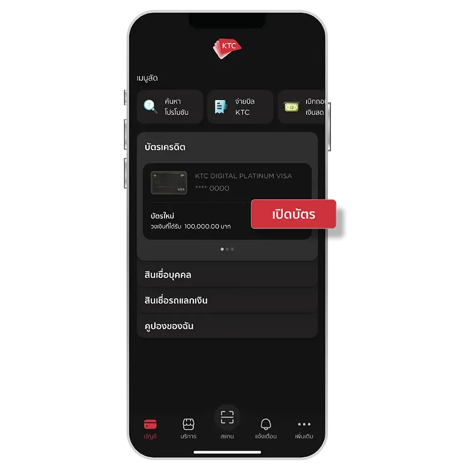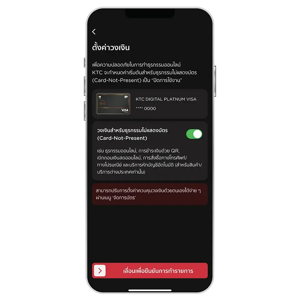 กรณีต้องการปรับจำนวนวงเงินสำหรับธุรกรรมไม่แสดงบัตร สามารถตั้งค่าได้ผ่านแอป KTC Mobile ที่เมนูควบคุมวงเงิน
