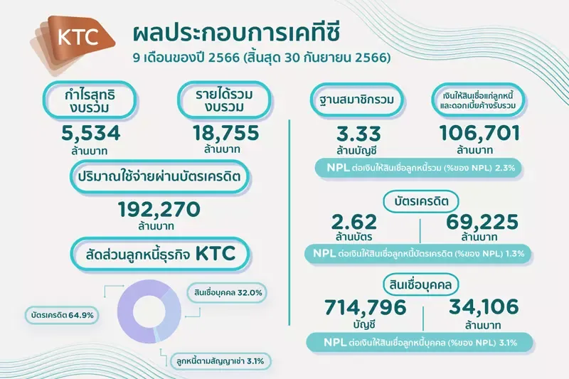 ผลการดำเนินงานของเคทีซี ณ วันที่ 30 กันยายน 2566 เปรียบเทียบกับช่วงเดียวกันของปี 2565งบการเงินรวมมีกำไรสุทธิในช่วง 9 เดือน และไตรมาส 3/2566 เท่ากับ 5,534 ล้านบาท (เพิ่มขึ้น 2.2%) และ 1,857 ล้านบาท (เพิ่มขึ้น 4.7%) ตามลำดับฐานสมาชิกรวม3,331,065 บัญชีแบ่งเป็นพอร์ตสมาชิกบัตรเครดิต2,616,269 บัตรเงินให้สินเชื่อแก่ลูกหนี้บัตรเครดิตและดอกเบี้ยค้างรับรวม 69,225 ล้านบาท ปริมาณการใช้จ่ายผ่านบัตรรวม 9 เดือนเท่ากับ 192,270 ล้านบาท เพิ่มขึ้น 13.7% NPL บัตรเครดิตอยู่ที่ 1.3%พอร์ตสมาชิกสินเชื่อบุคคลเคทีซี 714,796 บัญชีเงินให้สินเชื่อแก่ลูกหนี้บัตร กดเงินสด “เคทีซี พราว” และดอกเบี้ยค้างรับ 30,246 ล้านบาท เงินให้สินเชื่อแก่ลูกหนี้ “เคทีซี พี่เบิ้ม รถแลกเงิน” เท่ากับ 2,058 ล้านบาท NPL สินเชื่อบุคคลอยู่ที่ 3.1% ยอดสินเชื่อลูกหนี้ใหม่ (New Booking) ของ “เคทีซี พี่เบิ้ม รถแลกเงิน” ในไตรมาส 3/2566 เท่ากับ 794 ล้านบาท และรอบเก้าเดือนของปี 2566 มีมูลค่า 1,929 ล้านบาท สำหรับสินเชื่อลูกหนี้ตามสัญญาเช่าซื้อมีมูลค่า 3,369 ล้านบาท โดยมียอดปล่อยสินเชื่อใหม่ของรถขนาดใหญ่ที่ใช้ในอุตสาหกรรม (Commercial Loan) ในรอบ 9 เดือนของปี 2566 ที่ 1,446 ล้านบาท ทั้งนี้ เคทีซียังคงชะลอการปล่อยสินเชื่อประเภทนี้ หลังจากที่เห็นสัญญาณของหนี้เสียที่เพิ่มขึ้น