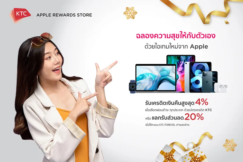 “เคทีซี”หรือบริษัท บัตรกรุงไทย จำกัด (มหาชน)ชวนสมาชิกช้อปของขวัญด้วยไอเท็มใหม่จาก Apple พร้อมมอบสิทธิพิเศษเมื่อช้อปผ่านบัตรเครดิตเคทีซี บนร้านค้าออนไลน์“KTCApple Rewards Store” ผ่านเว็บไซต์www.ktc.co.th/applerewardsstoreแลกรับเครดิตเงินคืน 4%เมื่อเลือกบริการผ่อนชำระด้วยบัตรเครดิตเคทีซี วีซ่า ทุกประเภท หรือแลกรับเครดิตเงินคืน 1%เมื่อเลือกบริการผ่อนชำระด้วยบัตรเครดิตเคทีซี ประเภทอื่น สินค้าที่ร่วมรายการ ประกอบด้วย iPhone iPad Apple Watch และ Mac Book ทุกรุ่น เป็นต้น นอกจากนี้สมาชิกยังสามารถแลกรับส่วนลดค่าเครื่อง 20% เมื่อใช้คะแนนKTC FOREVERเท่ายอดช้อป สำหรับสินค้าทุกรายการบนเว็บไซต์ ตั้งแต่วันที่28ตุลาคม2563 –วันที่31มกราคม2564
