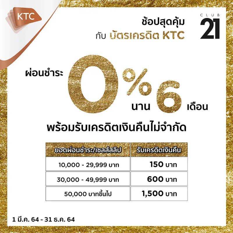 “เคทีซี”หรือบริษัท บัตรกรุงไทย จำกัด (มหาชน)ร่วมกับแบรนด์ในเครือ Club 21มอบสิทธิพิเศษให้กับสมาชิกที่ใช้จ่ายผ่านบัตรเครดิตเคทีซีที่ร้านค้าแบรนด์ในเครือClub 21รับสิทธิ์ผ่อนชำระ0% นาน 6 เดือน พร้อมรับเครดิตเงินคืนไม่จำกัดดังนี้ ยอดผ่อนชำระ 10,000 – 29,999 บาท ต่อเซลส์สลิป รับเครดิตเงินคืน 150 บาท ยอด 30,000 – 49,999 บาทต่อเซลส์สลิป รับเครดิตเงินคืน 600 บาท และยอด 50,000 บาทขึ้นไปต่อเซลส์สลิป รับเครดิตเงินคืน 1,500 บาท สมาชิกลงทะเบียนเพื่อรับสิทธิ์ เพียงส่ง SMS ลงทะเบียนครั้งเดียวตลอดรายการ ภายในวันที่มียอดใช้จ่าย พิมพ์ CLB เว้นวรรค ตามด้วยหมายเลขบัตรเครดิต 16 หลัก ส่งมาที่ 061-384-5000 (ค่าส่งครั้งละ 3 บาท) หรือลงทะเบียนผ่านทางเว็บไซต์ www.ktc.co.th/ club21installment หรือ สแกน QR Code ตั้งแต่วันที่1 มีนาคม 2564 – วันที่ 31 ธันวาคม 2564
