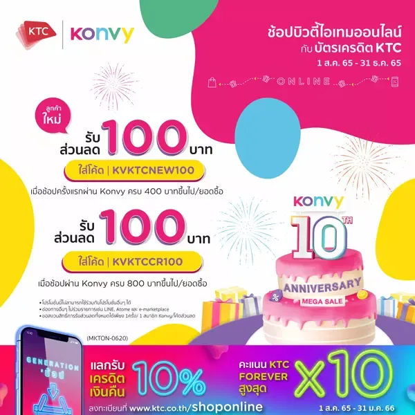 “เคทีซี”หรือบริษัท บัตรกรุงไทย จำกัด (มหาชน)อัดโปรโมชันช้อปออนไลน์ทุกหมวดใช้จ่าย ให้สมาชิกรับความคุ้มค่ายิ่งกว่า ล่าสุดร่วมกับ“คอนวี่”(Konvy) เว็บไซต์เครื่องสำอางอันดับ 1 ในประเทศไทยมอบส่วนลดสูงสุด200 บาทในโอกาสครบรอบ 10 ปี ให้กับสมาชิกบัตรเครดิตเคทีซีทุกประเภทที่ซื้อสินค้าผ่านเว็บไซต์www.konvy.comและแอปพลิเคชัน “Konvy”รับส่วนลด 100 บาทสำหรับสมาชิกที่ ช้อปออนไลน์กับ Konvy ครั้งแรก และมียอดซื้อครบ 400 บาทขึ้นไป โดยระบุโค้ดส่วนลด “KVKTCNEW100”รับส่วนลด 100 บาทเมื่อช้อปครบ 800 บาทขึ้นไปต่อยอดซื้อ โดยระบุโค้ดส่วนลด “KVKTCCR100” ระหว่างวันที่ 1 สิงหาคม 2565 – 31 ธันวาคม 2565 รายละเอียดเพิ่มเติมhttps://ktc.today/Konvy