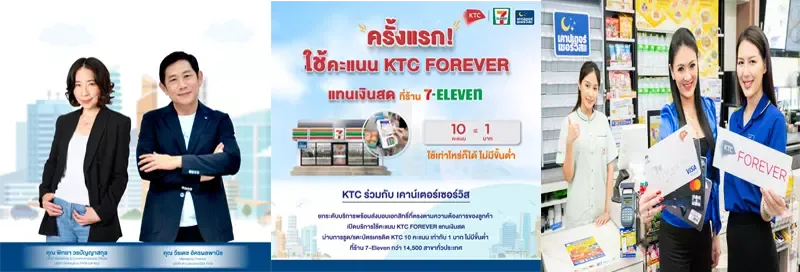 “เคทีซี”หรือ บริษัท บัตรกรุงไทย จำกัด (มหาชน) ตอกย้ำผู้นำคะแนนน้อยแลกได้ จับมือ บริษัทเคาน์เตอร์เซอร์วิส จำกัด ผู้ให้บริการรับชำระค่าสินค้าและบริการที่7-Eleven ทุกสาขา ออกแคมเปญ “ใช้คะแนน KTC FOREVER แทนเงินสด ด้วยบัตรเครดิตเคทีซีที่ 7-Eleven” ครั้งแรกกับการเปิดให้สมาชิกบัตรเครดิตเคทีซีสามารถใช้คะแนน KTC FOREVER เริ่มต้นเพียง 10 คะแนน แลกแทนเงินสดได้ 1 บาท เพื่อใช้ชำระค่าสินค้าที่7-Eleven 14,500 สาขาทั่วไทย เพิ่มความสะดวกสบายและความคุ้มค่าให้แก่สมาชิก คาดสมาชิกแลกใช้คะแนนทั้งแคมเปญ 20 ล้านคะแนน