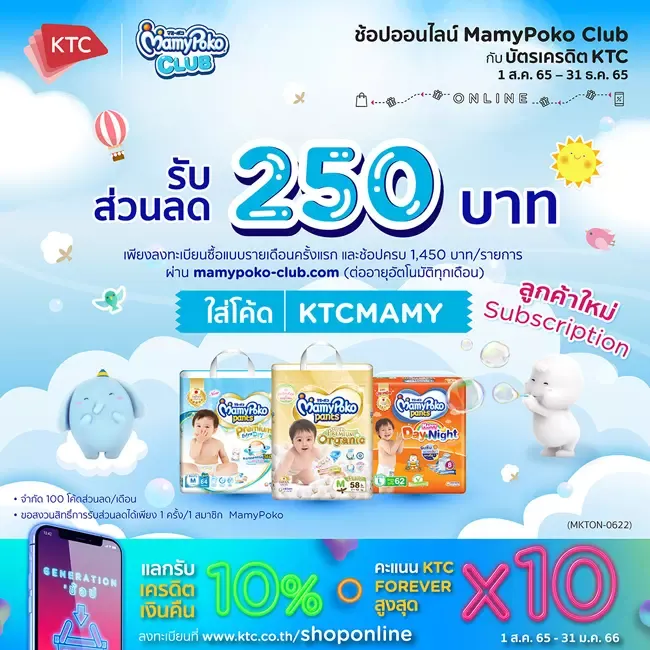 เคทีซี”หรือบริษัท บัตรกรุงไทย จำกัด (มหาชน)ตระหนักถึงภาระค่าใช้จ่ายของผู้บริโภคที่ปรับตัวสูงขึ้นในภาวะเงินเฟ้อเช่นปัจจุบัน โดยเฉพาะครอบครัวที่ต้องรับภาระเลี้ยงดูลูกน้อย จึงได้ร่วมกับ“มามี่โพโค”(MamyPoko) มอบส่วนลด 250 บาทให้กับสมาชิกบัตรเครดิตเคทีซีที่เป็นลูกค้าใหม่และสมัครซื้อผ้าอ้อมออนไลน์แบบรายเดือน (Subscription) ครบ 1,450 บาทต่อรายการ ผ่านmamypoko-club.comโดยระบุรหัสส่วนลด“KTCMAMY” ระหว่างวันที่ 1 สิงหาคม 2565 – 31 ธันวาคม 2565