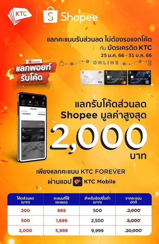 “ในไตรมาสแรกนี้ เคทีซีจึงได้ผนึกความคุ้มค่าของคะแนนสะสมเคทีซี ซึ่งสมาชิกให้การตอบรับดีมาโดยตลอด    เข้ากับช้อปปี้ (Shopee) อีคอมเมิร์ซยอดนิยมในไทย จัดโครงการให้สมาชิกบัตรเครดิตเคทีซีสามารถใช้คะแนนผ่านแอปฯ KTC Mobile แลกรับโค้ดส่วนลดจากช้อปปี้ 2 รูปแบบ คือ 1) แลกรับโค้ดส่วนลดสูงสุด Shopee 1,000 บาทเมื่อใช้ 5,999 คะแนน (ปกติ 10,000 คะแนน) และมียอดใช้จ่ายขั้นต่ำ 5,000 บาท หรือรับโค้ดส่วนลด 300 บาท เมื่อใช้ 2,499 คะแนน หรือรับโค้ดส่วนลด 100 บาท เมื่อใช้ 999 คะแนนตั้งแต่วันที่25 มกราคม 2566 – 30 เมษายน 25662)แลกรับโค้ดส่วนลดสูงสุด Shopee 2,000 บาทเมื่อใช้คะแนน 5,999 บาท (ปกติ 20,000 คะแนน) และมียอดใช้จ่ายขั้นต่ำ 9,999 บาท หรือรับโค้ดส่วนลด 500 บาท เมื่อใช้ 1,699 คะแนน (ปกติ 5,000 คะแนน) และมียอดใช้จ่ายขั้นต่ำ 2,500 บาท หรือรับโค้ดส่วนลด 200 บาท เมื่อใช้ 999 คะแนน (ปกติ 2,000 คะแนน) และมียอดใช้จ่ายขั้นต่ำ 500 บาทตั้งแต่วันที่25 มกราคม 2566 – 31 มกราคม 2566โดยคาดว่ากิจกรรมการตลาดในครั้งนี้ จะมีสมาชิกมาแลกคะแนนไม่น้อยกว่า 30 ล้านคะแนน ค้นหารายละเอียดเพิ่มเติมคลิกhttps://www.ktc.co.th/promotion/online/shopping/shopee