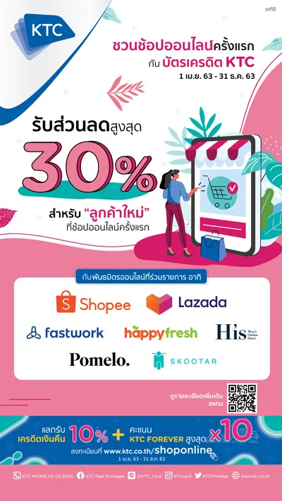 “เคทีซี”หรือบริษัท บัตรกรุงไทย จำกัด (มหาชน)ร่วมสร้างประสบการณ์ใหม่ด้วยสิทธิพิเศษสุดเอ็กซ์คลูซีฟเฉพาะ#ลูกค้าใหม่ที่ช้อปออนไลน์ครั้งแรกกับ 7 พันธมิตรธุรกิจชั้นนำ และชำระด้วยบัตรเครดิต เคทีซี ดังนี้#ลูกค้าใหม่Shopee รับส่วนลด 20%เมื่อสมัครเป็นสมาชิกและช้อปครั้งแรกด้วยบัตรเครดิตเคทีซีตั้งแต่ 500 บาทขึ้นไป ผ่านแอปฯ “Shopee” เท่านั้น และใส่โค้ด “KTCONLINE” (จำกัดส่วนลดสูงสุด 200 บาท) ตั้งแต่ 1 เมษายน 2563 – 31 ธันวาคม 2563#ลูกค้าใหม่Lazada Mastercard รับส่วนลด 20%ทันที เมื่อช้อปผ่านบัตรเครดิตเคทีซี-มาสเตอร์การ์ด ครั้งแรกกับแอปฯ “LAZADA” เท่านั้น และใส่โค้ดส่วนลด “KTCNEWMCLAZ20” ไม่กำหนดยอดซื้อขั้นต่ำต่อรายการ (จำกัดส่วนลดสูงสุด 250 บาท) ตั้งแต่ 1 กรกฎาคม 2563 – 31 ธันวาคม 2563#ลูกค้าใหม่Pomeloรับส่วนลด30%เมื่อสมัครเป็นสมาชิกและช้อปครั้งแรกด้วยบัตรเครดิตเคทีซีตั้งแต่ 990 บาทขึ้นไป ผ่านแอปฯ “Pomelo” หรือ www.pomelofashion.com/th และใส่โค้ด “KTCPNEW” (จำกัดส่วนลดสูงสุด 300 บาท) ตั้งแต่ 1 สิงหาคม 2563 – 31 ตุลาคม 2563