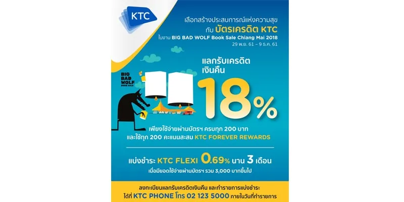 “เคทีซี”หรือบริษัท บัตรกรุงไทย จำกัด (มหาชน)ร่วมมือกับบริษัท เรดดี้ทูรี๊ด จำกัดมอบสิทธิพิเศษเพื่อสมาชิกรักการอ่านชาวเชียงใหม่ และจังหวัดใกล้เคียง เป็นครั้งแรกในงานมหกรรม “Big Bad Wolf Book Sale Chiang Mai 2018” พบกับหนังสือภาษาอังกฤษคุณภาพมากกว่า 1 ล้านเล่ม ในราคาลดพิเศษ 50% - 90% สมาชิกเคทีซี สามารถแลกรับเครดิตเงินคืนได้18%เพียงใช้จ่ายผ่านบัตรเครดิตเคทีซีครบทุก 200 บาท พร้อมใช้คะแนนKTC FOREVER REWARDSทุก 200 คะแนนพิเศษเลือกรับบริการแบ่งชำระKTC FLEXI 0.69%ได้นานถึง 3 เดือน เมื่อใช้จ่ายผ่านบัตรฯ ครบ 3,000 บาทขึ้นไป โดยลงทะเบียนแลกรับเครดิตเงินคืน และรายการแบ่งชำระได้ที่บูธเคทีซีภายในงานระหว่างวันที่29 พฤศจิกายน 2561 – 9 ธันวาคม 2561 ณ ศูนย์แสดงสินค้านานาชาติฯ จังหวัดเชียงใหม่