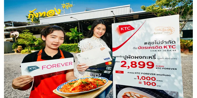 “เคทีซี”หรือบริษัท บัตรกรุงไทย จำกัด (มหาชน)ร่วมกับร้านอาหารกุ้งทอง ซีฟู้ดร้านอาหารซีฟู้ดแบบไทยแท้สูตรโบราณที่ได้รับการถ่ายทอดจากรุ่นสู่รุ่น ให้สมาชิกแลกคุ้มกับเมนูซิกเนเจอร์ปูผัดผงกะหรี่ มูลค่า450 บาทเพียงใช้คะแนนKTC FOREVER 2,899 คะแนนหรือใช้คะแนนKTC FOREVER ทุก 1,000 คะแนน แทนส่วนลด 100 บาทเมื่อชำระด้วยบัตรเครดิตเคทีซีตั้งแต่วันที่1 กุมภาพันธ์ 2563 – 31 มีนาคม 2563