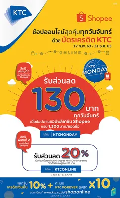 • สำหรับผู้ใช้งานเดิม วันจันทร์วันจ่าย (เริ่มตั้งแต่เที่ยงวันเป็นต้นไป) เมื่อช้อปสินค้าผ่านแอปพลิเคชัน“Shopee” และชำระด้วยบัตรเครดิตเคทีซี รับส่วนลดทันที 130 บาท เมื่อซื้อสินค้าครบ 1,300 บาทต่อรายการ และใส่โค้ด “KTCMONDAY”  ตั้งแต่วันที่ 17 กุมภาพันธ์ 2563 – 31 ธันวาคม 2563