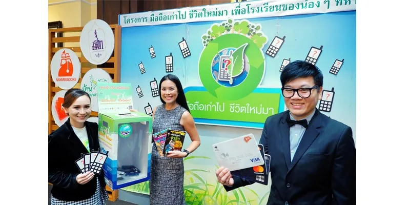 นายธีรพจน์ โชคอนันตัง ผู้ช่วยประธานเจ้าหน้าที่บริหาร - ธุรกิจบัตรเครดิตเคทีซี” หรือบริษัท บัตรกรุงไทย จำกัด (มหาชน)(ขวา) จับมือนางสาวคิม จงสถิตย์วัฒนา(กลาง)กรรมการผู้จัดการ บริษัท นานมีบุ๊คส์ จำกัดและนางสาวสายฝน อภิธนัง หัวหน้าฝ่ายประชาสัมพันธ์โครงการ(ซ้าย) สนับสนุนโครงการ “มือถือเก่าไป ชีวิตใหม่มา เพื่อโรงเรียนของน้องๆ ที่ห่างไกล” โดยเปิดพื้นที่ในศูนย์บริการลูกค้า “เคทีซี ทัช” เป็นจุดร่วมรับบริจาคขยะอิเล็กทรอนิกส์ประเภท “โทรศัพท์มือถือเก่า” ที่ไม่ใช้งานแล้ว ทุกสภาพ ทุกรุ่น ทุกยี่ห้อ เพื่อส่งต่อไปเข้ากระบวนการรีไซเคิลตามมาตรฐานรองรับที่ถูกวิธี จากนั้นจะนำรายได้จากการรีไซเคิล ส่งมอบให้กับมูลนิธิสมเด็จพระเทพรัตนราชสุดาฯ  เพื่อช่วยเหลือการสร้างห้องสมุด รวมทั้งมอบหนังสือดีมีคุณภาพ ที่เหมาะสมสำหรับเด็กในแต่ละช่วงวัย  ให้กับโรงเรียนในท้องถิ่นทุรกันดารที่ขาดแคลน 500 แห่ง โดยผู้ประสงค์ร่วมบริจาคมือถือเก่าสามารถนำมามอบได้ที่กล่องรับบริจาค ณ เคทีซี ทัช 20 สาขาทั่วประเทศตั้งแต่วันที่ 16 กรกฎาคม 2561 ถึง 31 สิงหาคม 2561