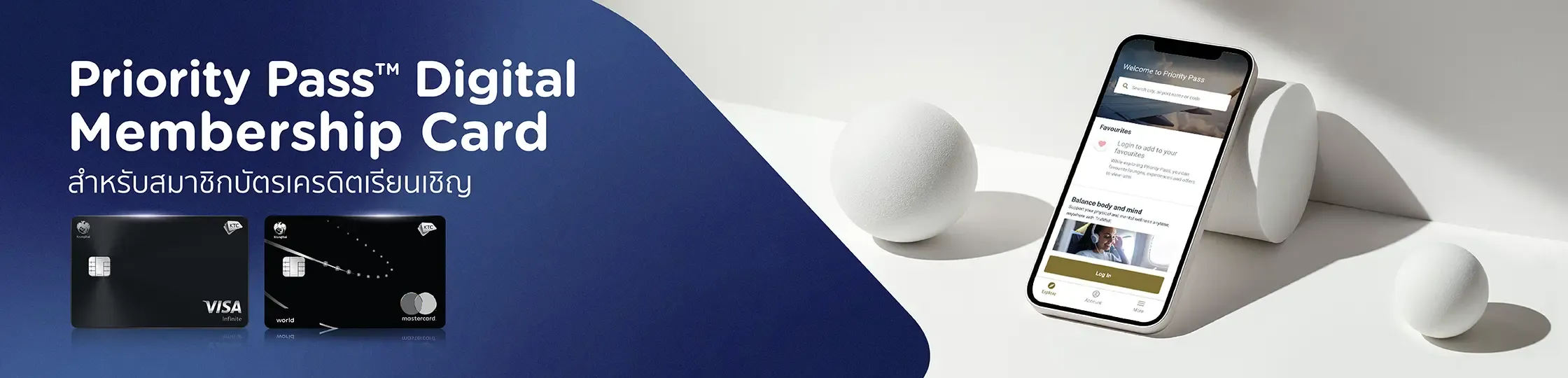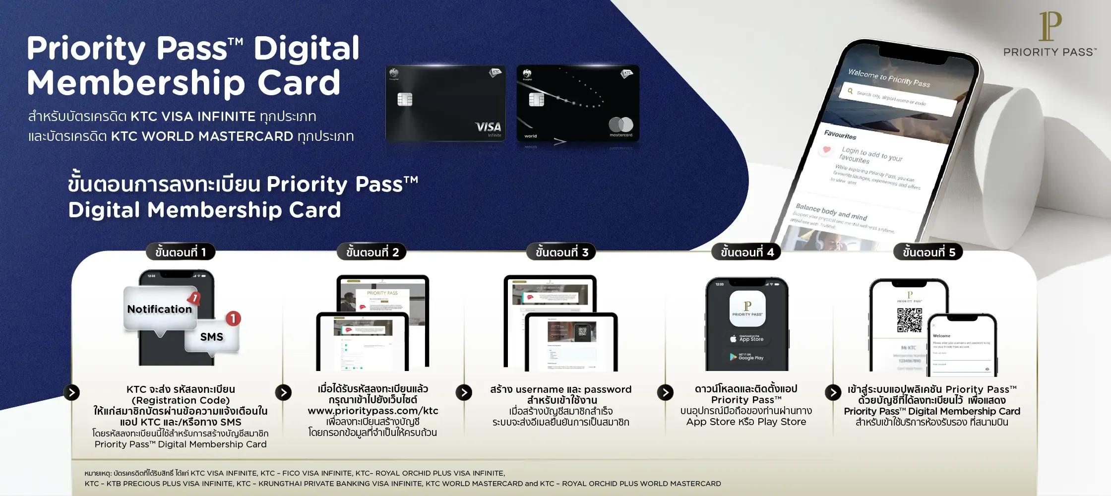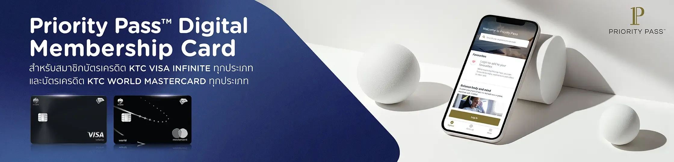สมาชิกบัตรเครดิต KTC VISA INFINITE และ KTC WORLD MASTERCARD ทุกประเภท ทั้งบัตรหลักและบัตรเสริมที่ได้รับสิทธิ์ภายใต้เงื่อนไขที่กำหนด สามารถเข้าใช้บริการห้องพักรับรองที่สนามบินผ่าน Priority Pass™ Digital Membership Card บนแอปพลิเคชัน Priority Pass™ ตั้งแต่วันที่ 1 กุมภาพันธ์ 2569 เป็นต้นไป