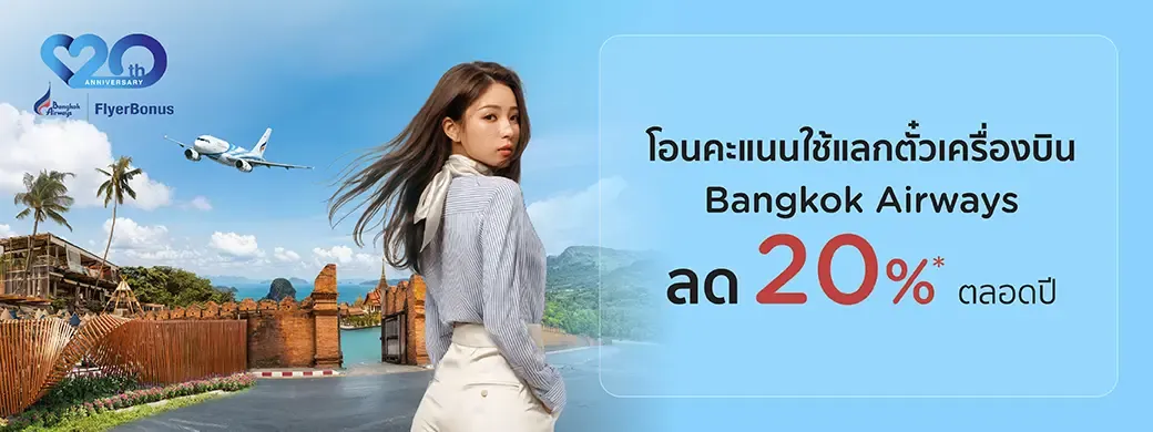 เฉลิมฉลองครบรอบ 20 ปี ฟลายเออร์โบนัส สมาชิกบัตรเครดิต KTC สามารถโอนคะแนน KTC FOREVER ไปเป็นคะแนนฟลายเออร์โบนัส เพื่อรับสิทธิ์แลกบัตรโดยสารบางกอกแอร์เวย์สด้วยคะแนนฟลายเออร์โบนัสลด 20%* ทุกเส้นทาง