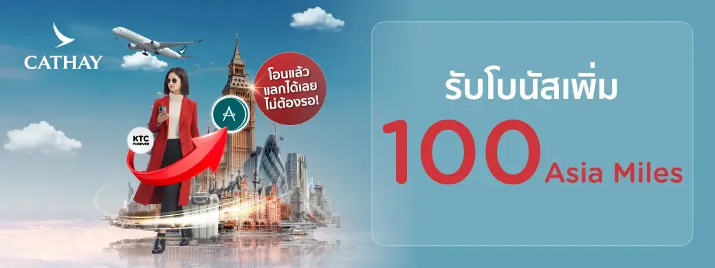 3. สงวนสิทธิ์ในการคำนวณยอดโอนคะแนน KTC FOREVER ไปยัง Asia Miles ระหว่างวันที่ 1 ก.พ. 69 – 30 เม.ย. 69 (นับจากวันที่ทำรายการโอนคะแนนกับเคทีซีเป็นหลัก) ครบทุกๆ 5,000 Asia Miles รับเพิ่ม โบนัส 100 Asia Miles