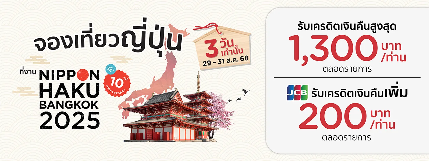 29 ส.ค. 68 – 31 ส.ค. 68 เวลา 10:00 - 20:00 น. ณ Hall 5 - 6 ชั้น LG ศูนย์การประชุมแห่งชาติสิริกิติ์ เมื่อมียอดใช้จ่ายผ่านบัตรฯ กับร้านค้าในหมวดท่องเที่ยวที่ร่วมรายการภายในงาน นำเซลส์สลิปและบัตรเครดิต KTC ลงทะเบียนที่บูธ KTC ภายในวันที่ทำรายการ รับโปรดีสุดคุ้ม