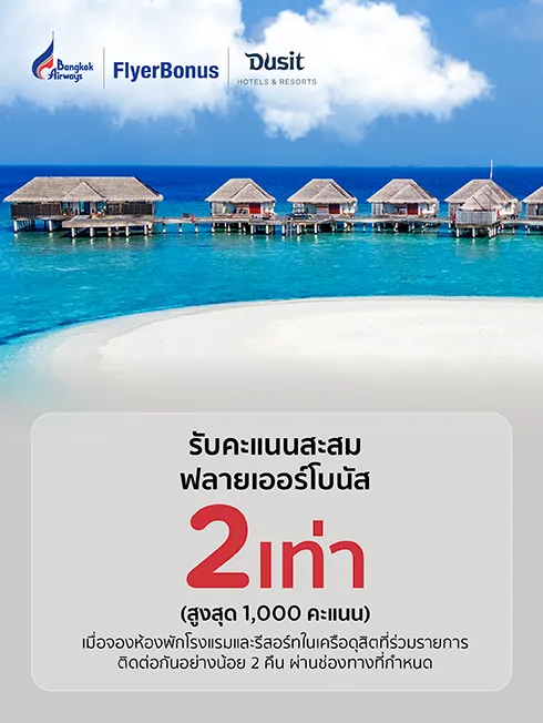 - เพื่อรับคะแนน FlyerBonus 2 เท่า ผู้เข้าพักต้องเป็นสมาชิก Dusit Gold พร้อมแสดงบัตรเครดิตร่วม KTC – BANGKOK AIRWAYS และหมายเลขสมาชิก FlyerBonus ผ่านแอป Dusit Hotels & Rewards ในระหว่างเช็คอิน