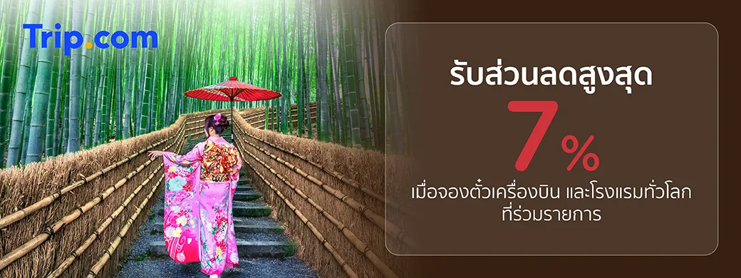 ที่พัก: สมาชิก Trip.com รับส่วนลดเพิ่มอีก 7% เมื่อจองที่พักที่ร่วมรายการทั่วโลกสูงสุด 2,500 บาท - รหัสโปรโมชั่นสามารถใช้งานกับการจองที่พักที่ชำระเงินล่วงหน้า ในสกุลเงินบาทไทย เท่านั้น