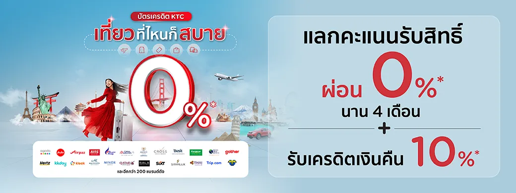 - เมื่อสมาชิกมียอดยอดใช้จ่ายที่พันธมิตรในหมวดท่องเที่ยวที่ร่วมรายการ ผ่านบัตรฯ แบบชำระเต็มจำนวน ตั้งแต่ 3,000 บาทขึ้นไปต่อเซลล์สลิป สมาชิกสามารถใช้คะแนนเท่ายอดใช้จ่ายเพื่อแลกรับสิทธิ์เปลี่ยนแปลงยอดใช้จ่ายผ่านบัตรฯ แบบชำระเต็มจำนวนดังกล่าว มาเป็นการใช้บริการผ่อนชำระกับบัตร KTC ในอัตราดอกเบี้ยและค่าธรรมเนียมการใช้วงเงิน 0% นาน 4 เดือน (“ผ่อนชำระกับบัตร KTC 0%”) ได้ และรับเครดิตเงินคืน 10% โดยแจ้งความประสงค์ในการรับสิทธิ์ ผ่านการลงทะเบียน ได้ที่ ktc.promo/travelinstallment หรือ ผ่านทาง KTC Phone โทร 02 123 5650 ภายในวันที่ทำรายการเท่านั้น โดยมีรายละเอียดเงื่อนไขการแลกรับสิทธิดังนี้
