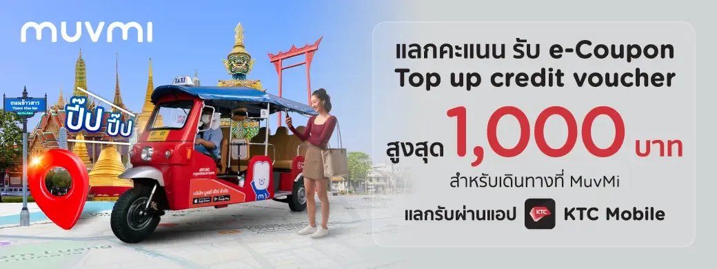 1. ใช้ 1,600 คะแนน KTC FOREVER + 300 บาท แลกซื้อ e-Coupon Top up Credit Voucher ที่ Muvmi มูลค่า 500 บาท ผ่านแอป KTC Mobile