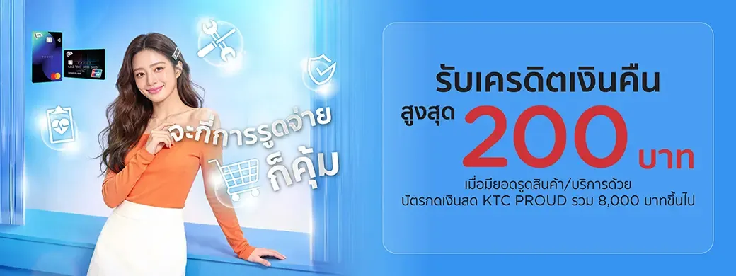 - เมื่อสมาชิกมียอดรูดซื้อสินค้า/บริการสะสมผ่านบัตรกดเงิน KTC PROUD ภายในระยะเวลารายการ จะได้รับเครดิตเงินคืนตามที่กำหนด ยอดรูดซื้อสินค้า/บริการตั้งแต่ 8,000 บาทขึ้นไป รับเครดิตเงินคืน 200 บาท