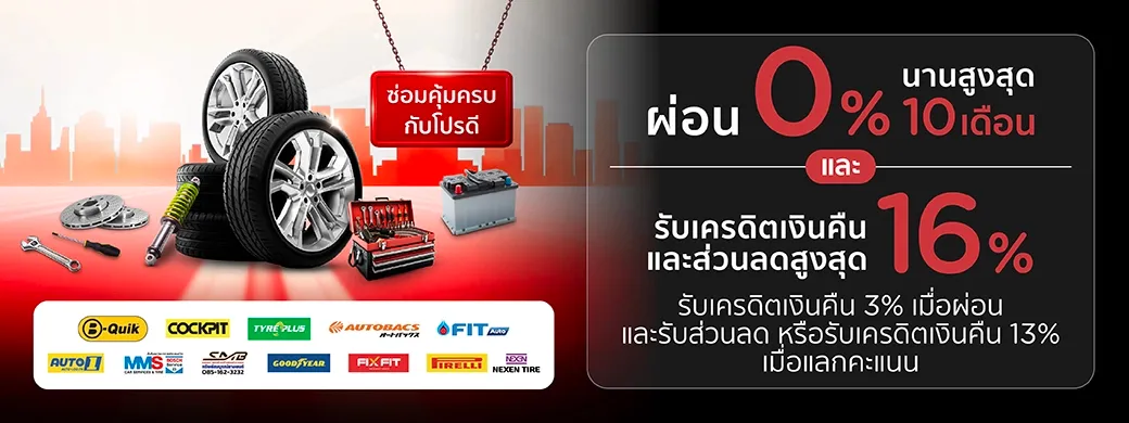 ศูนย์บริการรถยนต์ครบวงจร ได้แก่ B-Quik, COCKPIT, TYREPLUS, FIT Auto, Autobacs, AUTO1, FIX FIT, Subsomboon และ ร้านค้าตัวแทนจำหน่ายยาง ที่ร่วมรายการ