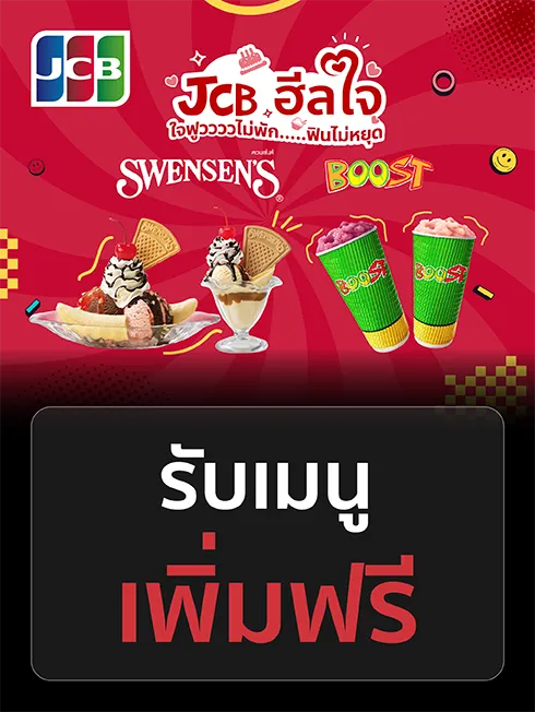 เมื่อมียอดใช้จ่ายครบตามกำหนดและกดรับสิทธิ์ผ่าน LINE @JCBThailand (ต้องผูกบัตรเครดิต และรับโค้ดสิทธิพิเศษหน้า JCB Reward) และแสดงสิทธิ์แก่พนักงานตามเงื่อนไขที่กำหนด ก่อนชำระเงินด้วยบัตรเครดิต KTC JCB ทุกประเภท ที่ Swensen’s และ Boost Juice สาขาที่ร่วมรายการ