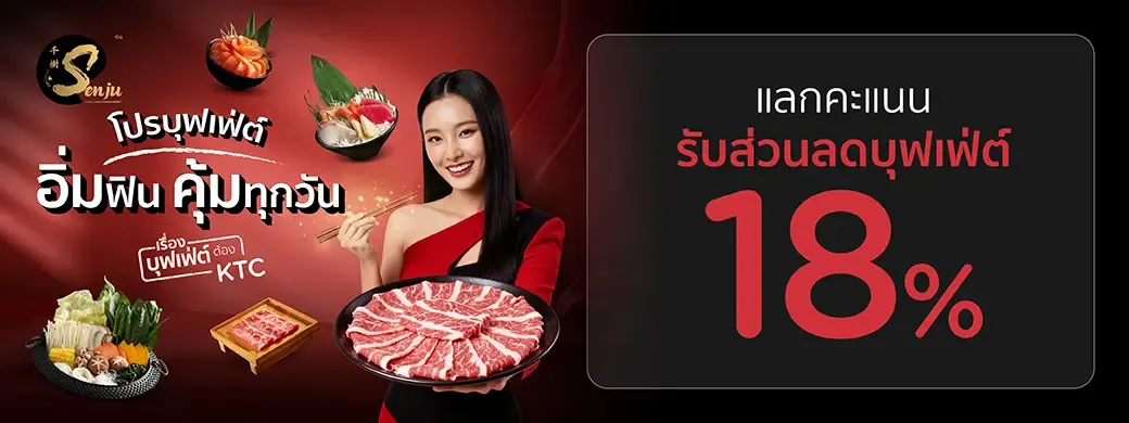 - สมาชิกที่ใช้จ่ายผ่านบัตรฯ สามารถแลกคะแนน KTC FOREVER เท่ากับยอดใช้จ่ายต่อเซลส์สลิป เพื่อรับส่วนลด 18% สำหรับการรับประทานบุฟเฟ่ต์ ตามเงื่อนไขที่กำหนด