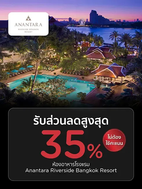 *กำหนดยอดใช้จ่ายขั้นต่ำ 3,000 บาทสุทธิ (ก่อนหักส่วนลด) สำหรับรายการอาหารเมนู A La Carte และเครื่องดื่มไม่มีแอลกอฮอล์ ณ ห้องอาหาร Benihana Riverside, Spice & Barley, Trader Vic’s Bangkok, Brio และ Longtail River Bar and Lounge