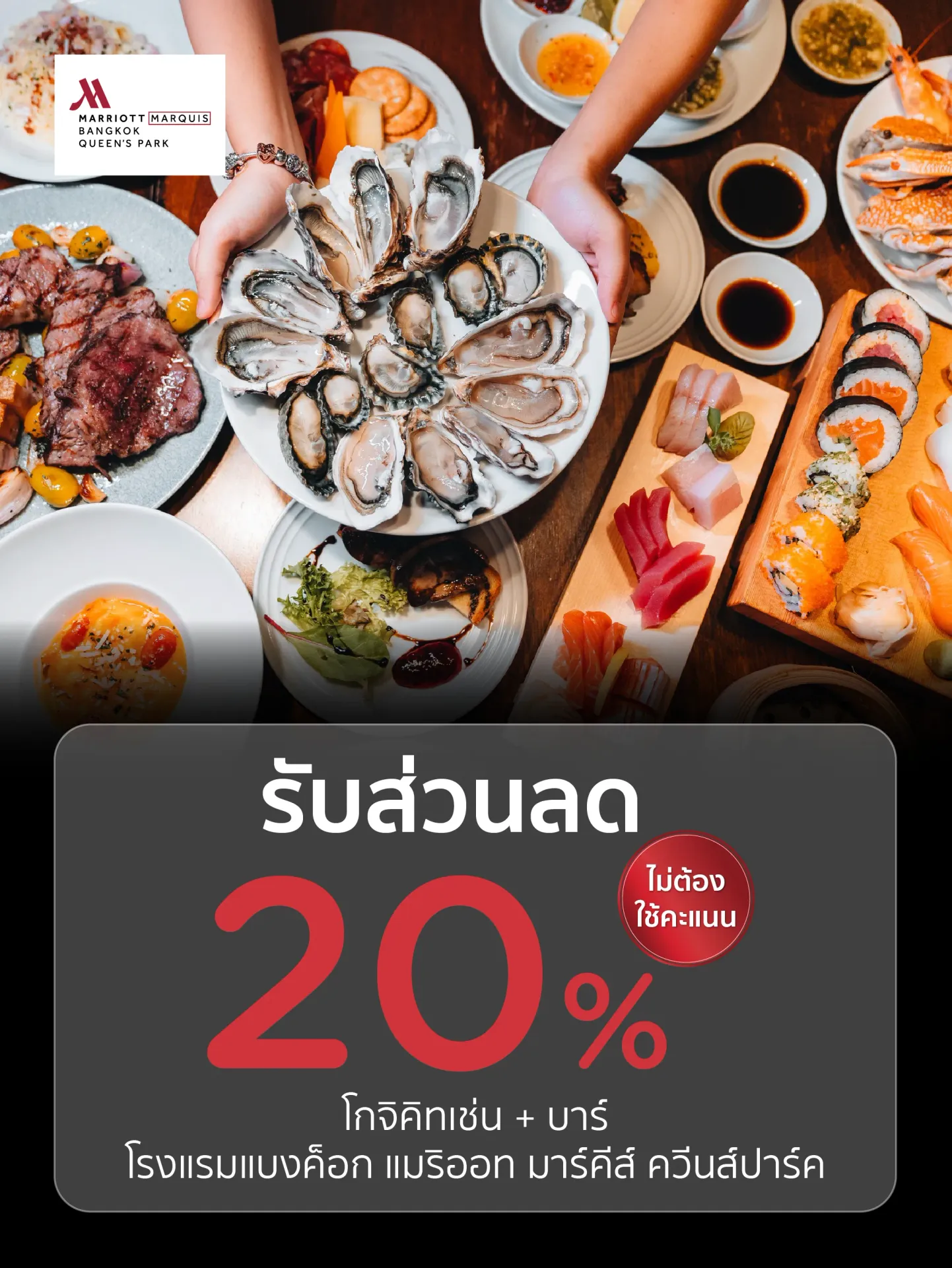 - บุฟเฟต์นานาชาติมื้อเย็นวันจันทร์-พฤหัสบดี พิเศษ 1,926 บาทสุทธิต่อท่าน (ปกติ 2,353 บาท)