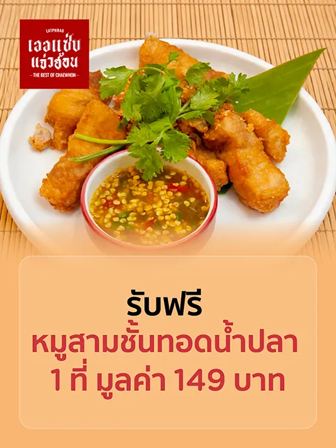 รับฟรี หมูสามชั้นทอดน้ำปลา 1 ที่ มูลค่า 149 บาท เมื่อทานครบ 1,500 บาท/เซลล์สลิป