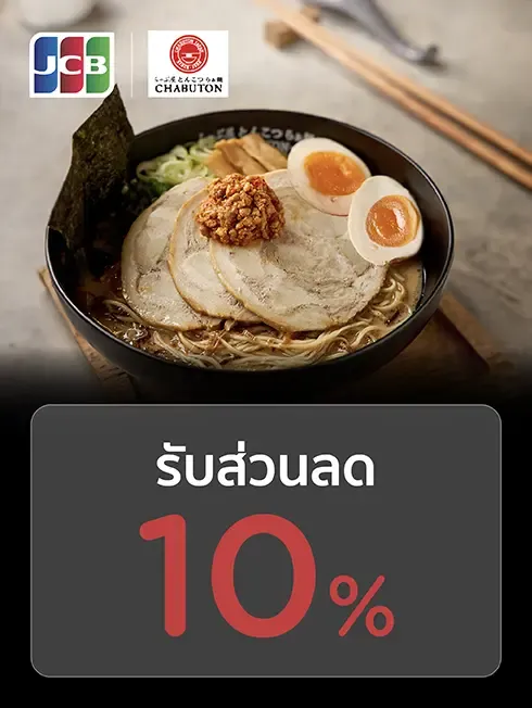 เมื่อมียอดใช้จ่ายตั้งแต่ 350 บาท ขึ้นไป / เซลส์สลิป (ก่อนหักส่วนลด) และชำระผ่านบัตรเครดิต KTC JCB ทุกประเภท ที่ร้าน Chabuton ทุกสาขา