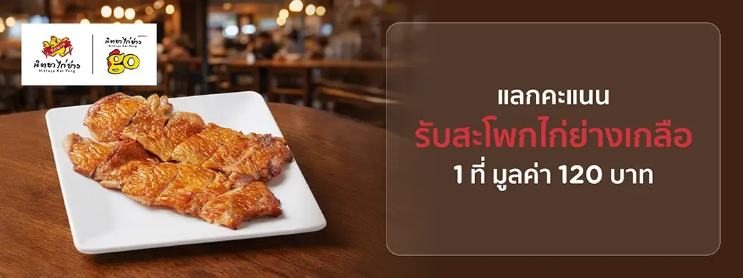 - รายการส่งเสริมการขาย (“รายการ”) นี้ บริษัท บัตรกรุงไทย จำกัด (มหาชน) หรือ เคทีซี จัดทำขึ้นเพื่อมอบสิทธิประโยชน์ให้แก่สมาชิกบัตรเครดิต KTC (“สมาชิก”) ที่มีคะแนน KTC FOREVER (“คะแนน”) เพื่อแลกรับสินค้า ณ ร้านนิตยาไก่ย่าง และ นิตยาไก่ย่าง GO ทุกสาขา ในช่วงระหว่างวันที่ 1 มีนาคม 2569 - 30 มิถุนายน 2569 (“ระยะเวลารายการ”) ตามเงื่อนไขที่กำหนดเท่านั้น