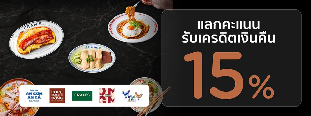 - สมาชิกที่มียอดใช้จ่ายผ่านบัตรฯ สามารถแลกคะแนนเท่ากับยอดใช้จ่ายต่อเซลส์สลิป เพื่อรับเครดิตเงินคืนได้ตามเงื่อนไขที่กำหนด