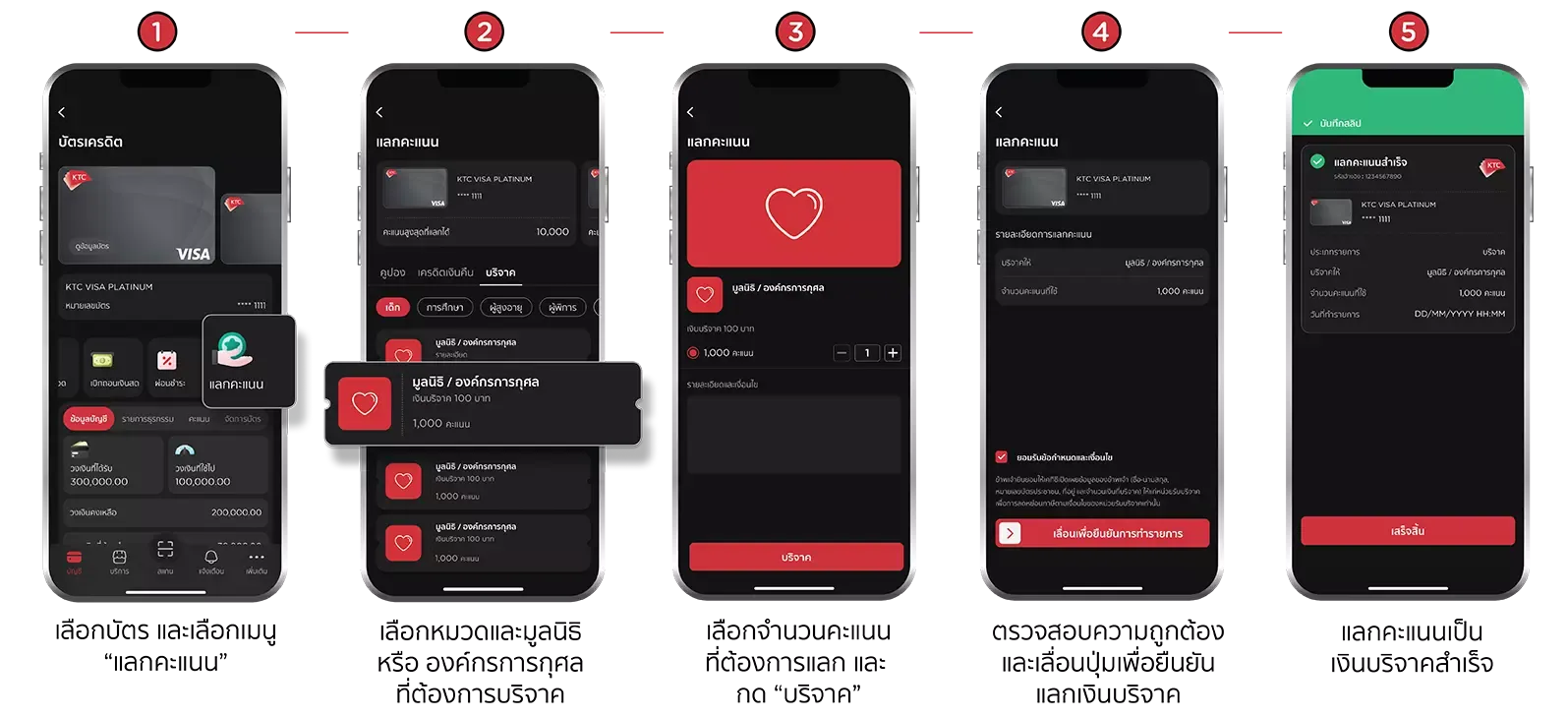 3. สมาชิกสามารถใช้ทุก 1,000 คะแนนแลกเงินบริจาค 100 บาท ผ่านแอป KTC Mobile ตามเงื่อนไขที่กำหนด