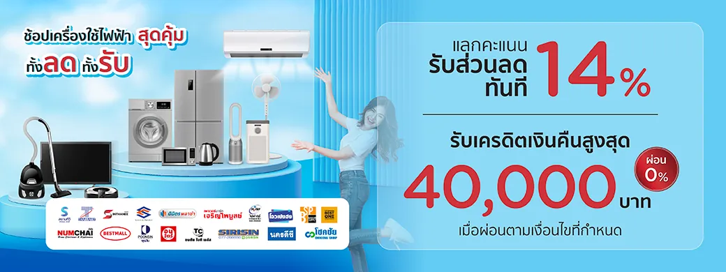 ผ่อนชำระ 0% นานสูงสุด 10 เดือน เฉพาะรุ่นที่ร่วมรายการ ตามที่แบรนด์เครื่องใช้ไฟฟ้าหรือร้านค้ากำหนด ตรวจสอบโปรโมชั่น และรุ่นที่ร่วมรายการ ณ จุดขาย