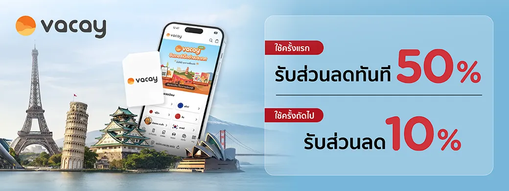 - ลูกค้าที่สั่งซื้อ Vacay ครั้งแรก แพ็กเกจใดก็ได้จะได้รับส่วนลด 50% เมื่อกรอกสิทธิ์โปรโมชั่น “KTC50” ส่วนลดสูงสุด 100 บาท ต่อการสั่งซื้อ