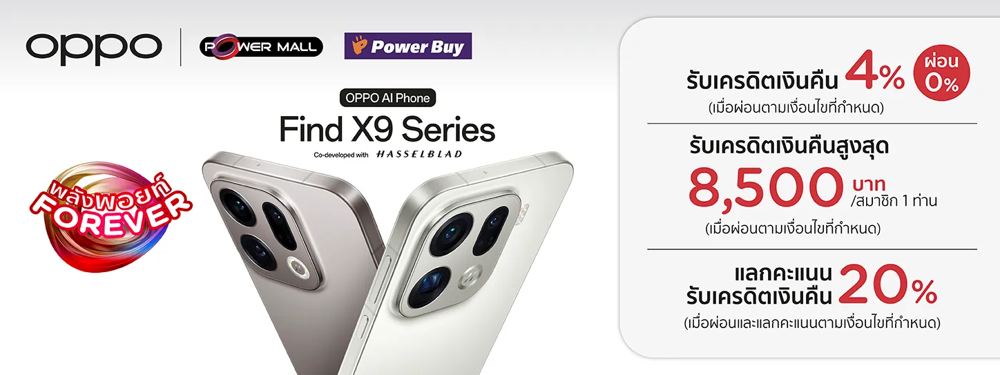 ต่อที่ 1 รับเครดิตเงินคืน 4% จากยอดผ่อนชำระสินค้า OPPO Find X9 Series