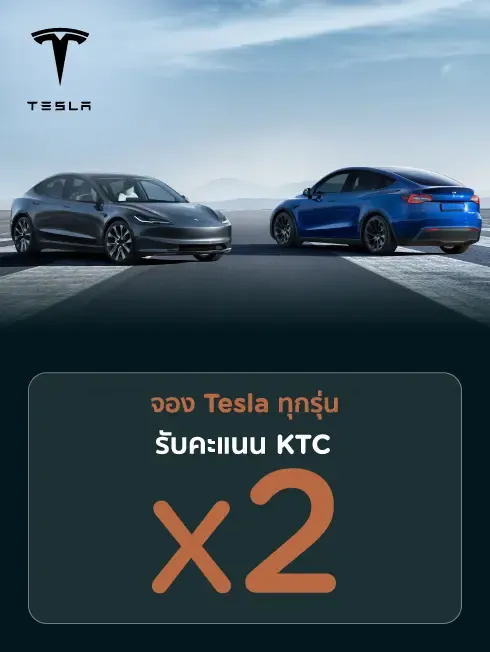 - สมาชิกที่ใช้จ่ายผ่านบัตรฯ สำหรับการชำระเงินจองรถที่ Tesla Thailand จะได้คะแนนพิเศษ 2 เท่า (จำกัดการให้คะแนน KTC X2 ที่ยอดจองสูงสุดที่ 4,000 บาทตามเงื่อนไขการจองรถที่ Tesla กำหนด) โดยสมาชิกจะต้องลงทะเบียนโดยส่งข้อความ SMS พิมพ์ TS1 เว้นวรรค ตามด้วยหมายเลขบัตรฯ 16 หลัก ส่งมาที่ 0613845000 หรือลงทะเบียนผ่านเว็บไซต์ KTC เดียวก่อนหรือภายในวันที่ทำรายการ รับสิทธิ์ตลอดรายการ