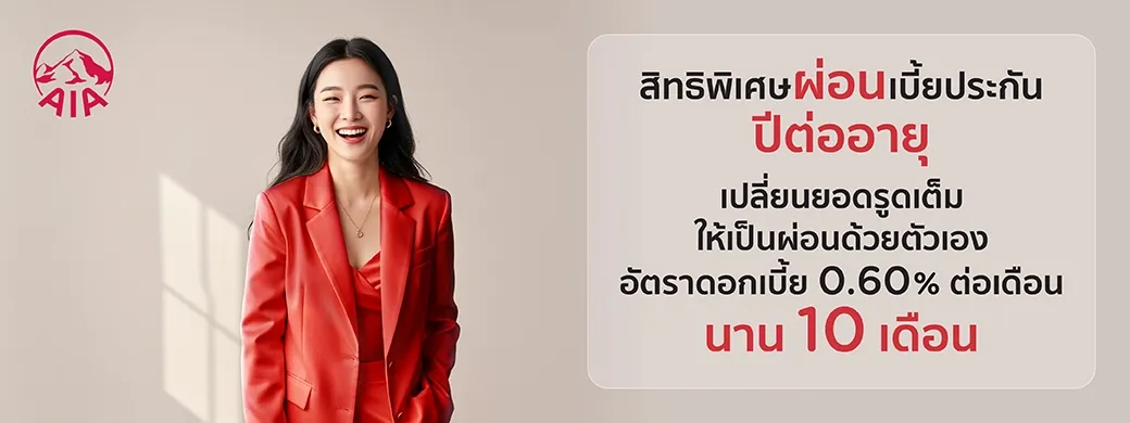 เมื่อชำระค่าเบี้ยประกันภัย AIA รับสิทธิ์ผ่อนชำระเบี้ยประกันภัยนาน 6 และ 10 เดือน ด้วยอัตราดอกเบี้ยพิเศษ 0.60% ต่อเดือน โดยลูกค้าเป็นผู้รับผิดชอบดอกเบี้ยผ่อนชำระ ตามรายละเอียดดังนี้
