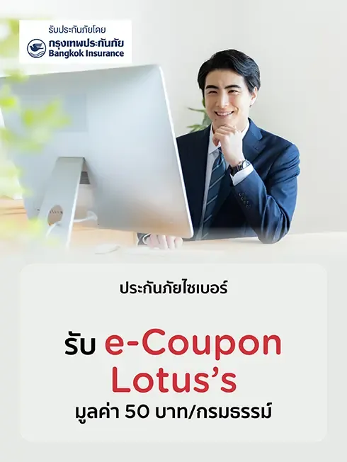 เมื่อซื้อผลิตภัณฑ์ประกันภัยไซเบอร์กับ บมจ.กรุงเทพประกันภัย ผ่านช่องทางออนไลน์ที่กำหนด และชำระเบี้ยประกันด้วยบัตรเครดิต KTC รับ e-Coupon Lotus’s มูลค่า 50 บาท/กรมธรรม์