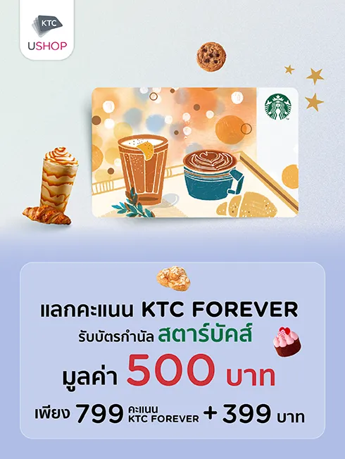 บัตรเครดิต KTC เพียงใช้คะแนนKTC FOREVER 799 คะแนน + 399 บาทรับเลย Starbucks Card มูลค่า 500 บาท