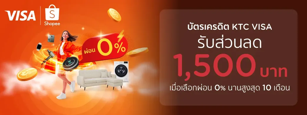 - เมื่อสมาชิกช้อปออนไลน์ผ่านแอป Shopee ด้วยบัตรเครดิต KTC VISA ทุกประเภท และเลือกผ่อนชำระ รับส่วนลด 1,500 บาท เมื่อช้อปครบ 12,000 บาท / รายการ เก็บโค้ดที่แอป Shopee