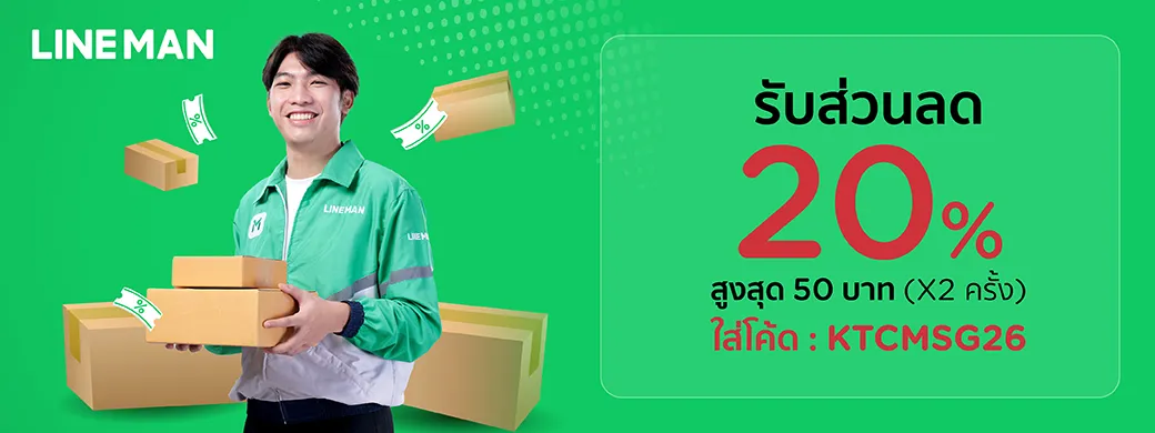 - เมื่อสมาชิกมียอดส่งของผ่านแอป LINE MAN ด้วยบัตรเครดิต KTC สมาชิกจะได้รับส่วนลด 20% สูงสุด 50 บาท (x2 ครั้ง) ไม่กำหนดยอดขั้นต่ำ/รายการ เมื่อใส่โค้ดส่วนลด >> “KTCMSG26”