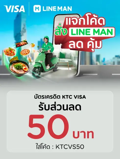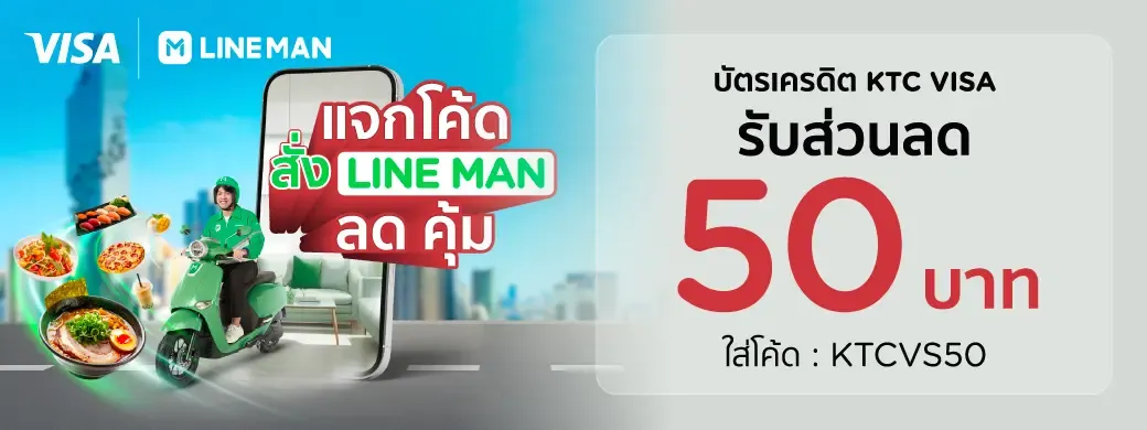- เมื่อสมาชิกมียอดสั่งอาหารผ่านแอป LINE MAN ด้วยบัตรเครดิต KTC VISA สมาชิกจะได้รับส่วนลด รับส่วนลด 50 บาท เมื่อซื้อขั้นต่ำ 300 บาทขึ้นไป/รายการ (ไม่รวมค่าขนส่ง) เมื่อใส่โค้ดส่วนลด >> “KTCVS50”