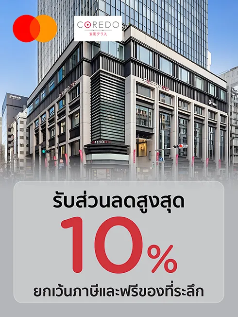 เมื่อรับคูปองที่นี่และนำไปแสดงแก่พนักงานที่เคาเตอร์ประชาสัมพันธ์ และเลือกชำระเงินด้วยบัตรเครดิต KTC MASTERCARD ทุกประเภทและบัตรกดเงินสด KTC PROUD MASTERCARD ที่ Coredo Muromachi ประเทศญี่ปุ่น