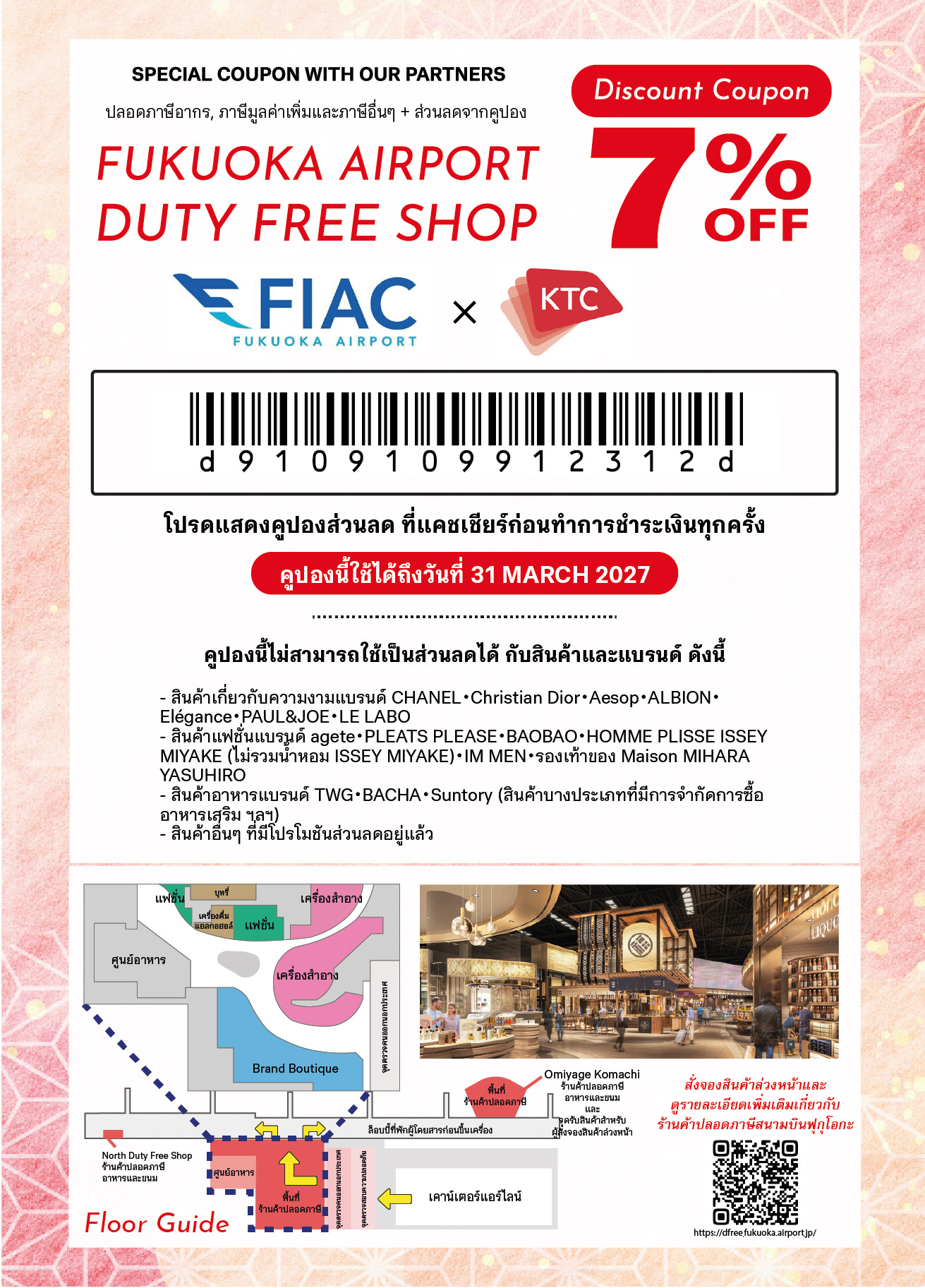 สำหรับสมาชิกบัตรเครดิต KTC ทุกประเภทและบัตรกดเงินสด KTC PROUD เมื่อชำระด้วยบัตรเครดิต KTC ณ Fukuoka Airport Duty Free