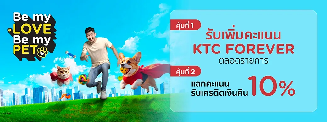 - รายการส่งเสริมการขาย (“รายการ”) นี้ บริษัท บัตรกรุงไทย จำกัด (มหาชน) หรือ เคทีซี จัดทำขึ้นเพื่อมอบสิทธิประโยชน์ให้แก่สมาชิกบัตรเครดิต KTC (“สมาชิก”) ที่มีคะแนน KTC FOREVER (“คะแนน”) และใช้จ่ายผ่านบัตรฯ ณ ร้านค้าสัตว์เลี้ยง และโรงพยาบาลสัตว์ที่ร่วมรายการ ภายใต้ MCC 5995, 742 ในช่วงระหว่างวันที่ 10 กันยายน 2568 – 28 กุมภาพันธ์ 2569 (“ระยะเวลารายการ”) ตามเงื่อนไขที่กำหนดเท่านั้น