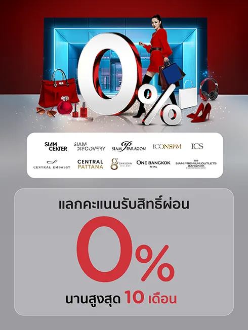 • ใช้คะแนน จำนวน 50% ของยอดค่าสินค้า/บริการ แลกรับสิทธิ์ผ่อนชำระ 0% นาน 10 เดือน