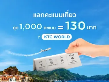 จองตั๋วเครื่องบิน ที่พัก รถเช่า และผลิตภัณฑ์ท่องเที่ยวทั้งในและต่างประเทศ แลกคะแนนรับส่วนลด 130 บาท ที่ KTC WORLD กับบัตรเครดิต KTC