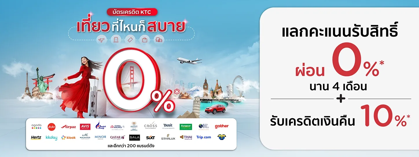 - เมื่อสมาชิกมียอดยอดใช้จ่ายที่พันธมิตรในหมวดท่องเที่ยวที่ร่วมรายการ ผ่านบัตรฯ แบบชำระเต็มจำนวน ตั้งแต่ 3,000 บาทขึ้นไปต่อเซลล์สลิป สมาชิกสามารถใช้คะแนนเท่ายอดใช้จ่ายเพื่อแลกรับสิทธิ์เปลี่ยนแปลงยอดใช้จ่ายผ่านบัตรฯ แบบชำระเต็มจำนวนดังกล่าว มาเป็นการใช้บริการผ่อนชำระกับบัตร KTC ในอัตราดอกเบี้ยและค่าธรรมเนียมการใช้วงเงิน 0% นาน 4 เดือน (“ผ่อนชำระกับบัตร KTC 0%”) ได้ และรับเครดิตเงินคืน 10% โดยแจ้งความประสงค์ในการรับสิทธิ์ ผ่านการลงทะเบียน ได้ที่ ktc.promo/travelinstallment หรือ ผ่านทาง KTC Phone โทร 02 123 5650 ภายในวันที่ทำรายการเท่านั้น โดยมีรายละเอียดเงื่อนไขการแลกรับสิทธิดังนี้