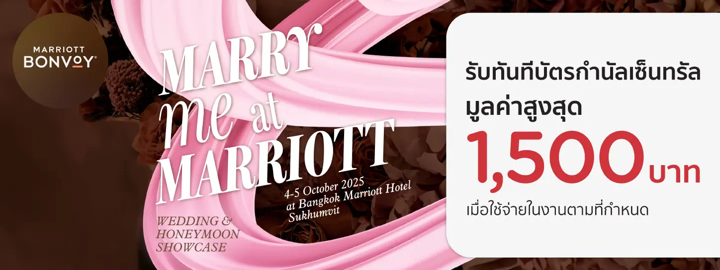งาน "Marry Me at Marriott" Wedding and Honeymoon Showcase นำเสนอการจัดงานแต่งงานและฮันนีมูน ทุกรายละเอียดครบในงานเดียว ให้คุณได้พูดคุยกับทีมงานมากประสบการณ์ การบริการแบบมืออาชีพ รวมถึงแพ็กเกจงานแต่งงานที่จัดให้ตรงกับความต้องการของคุณในโรงแรมและรีสอร์ททั่วประเทศ พร้อมชิมอาหารจากโรงแรมต่างๆในงาน
